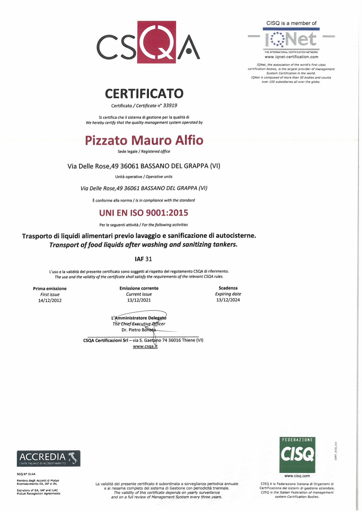 Aktuell kann Pizzato Trasporti auf die folgenden Zertifizierungen zählen: