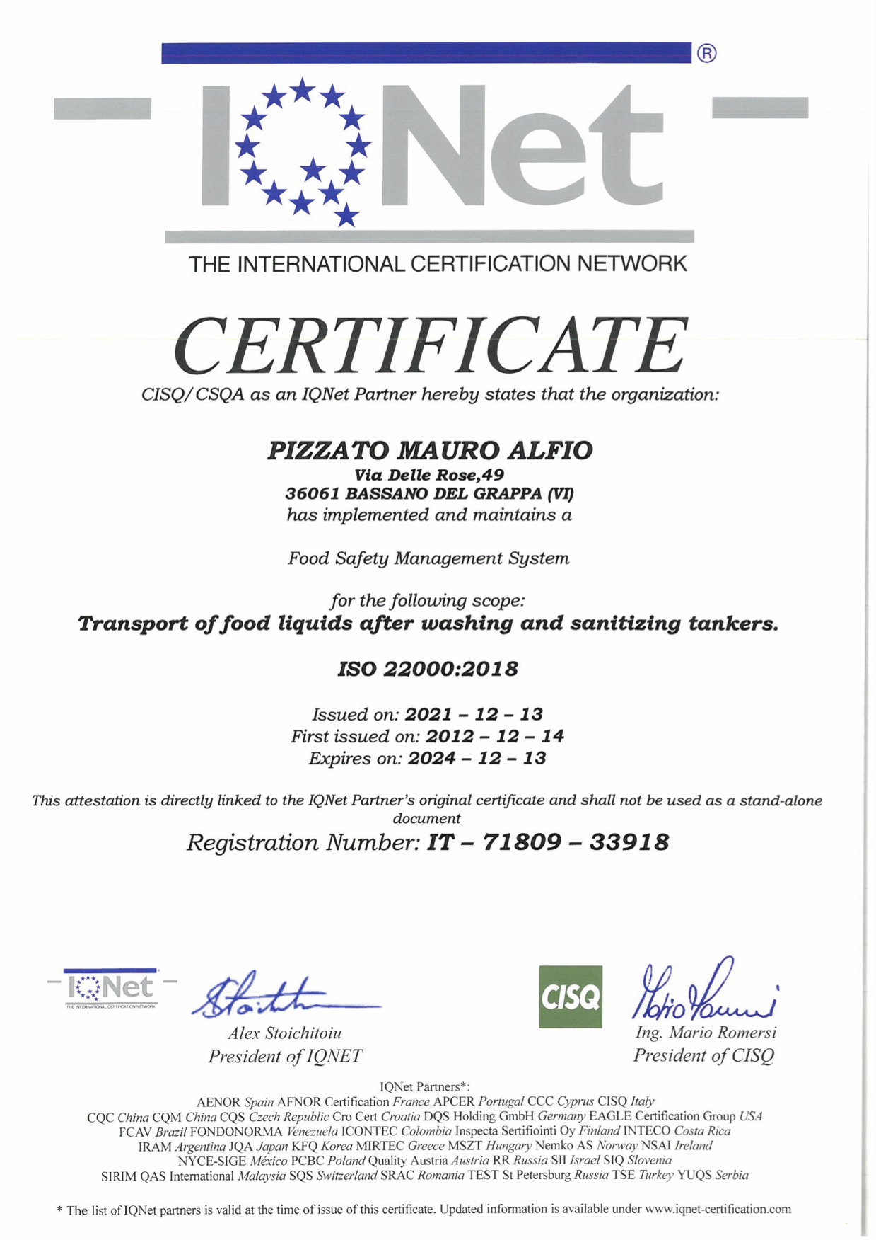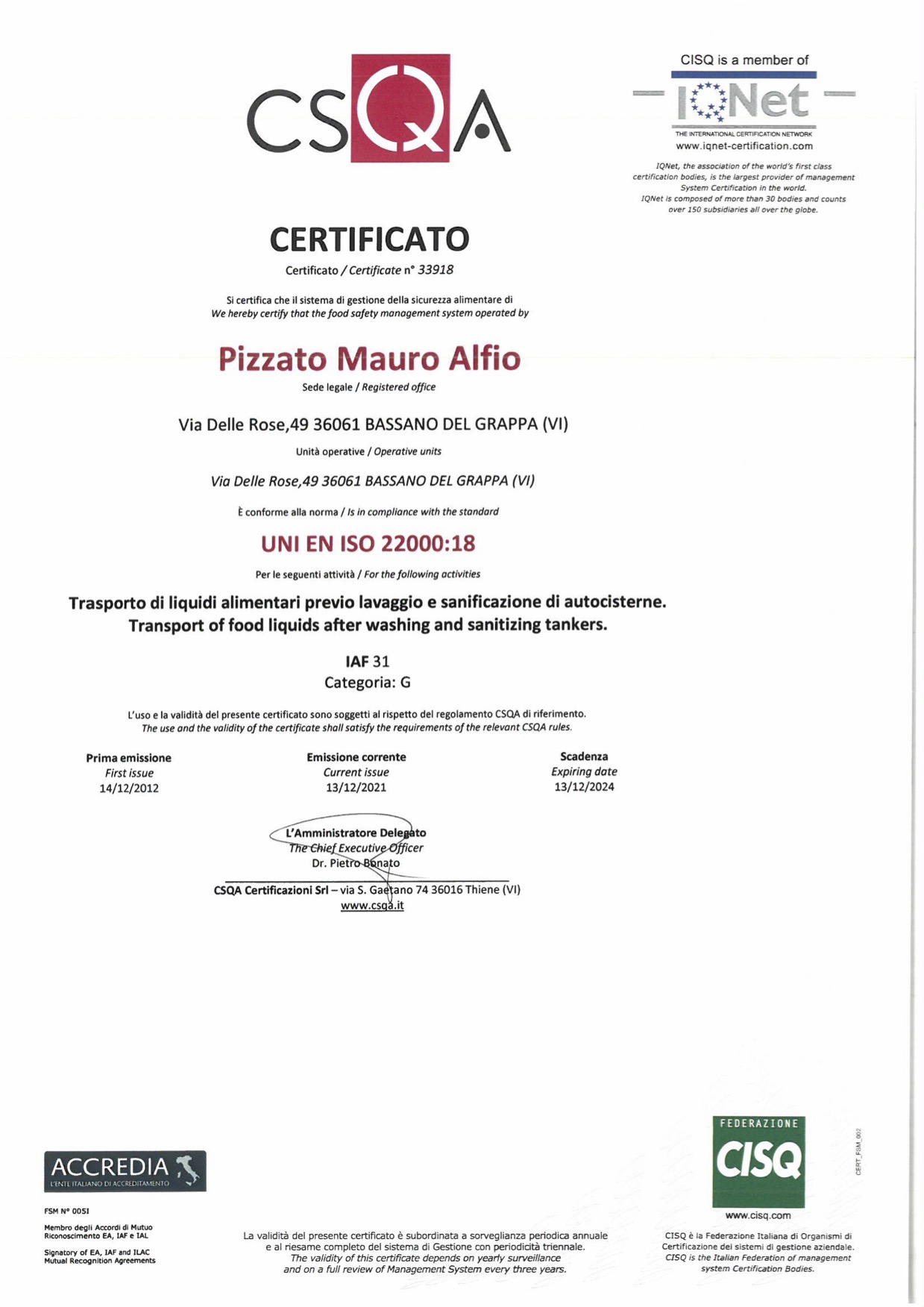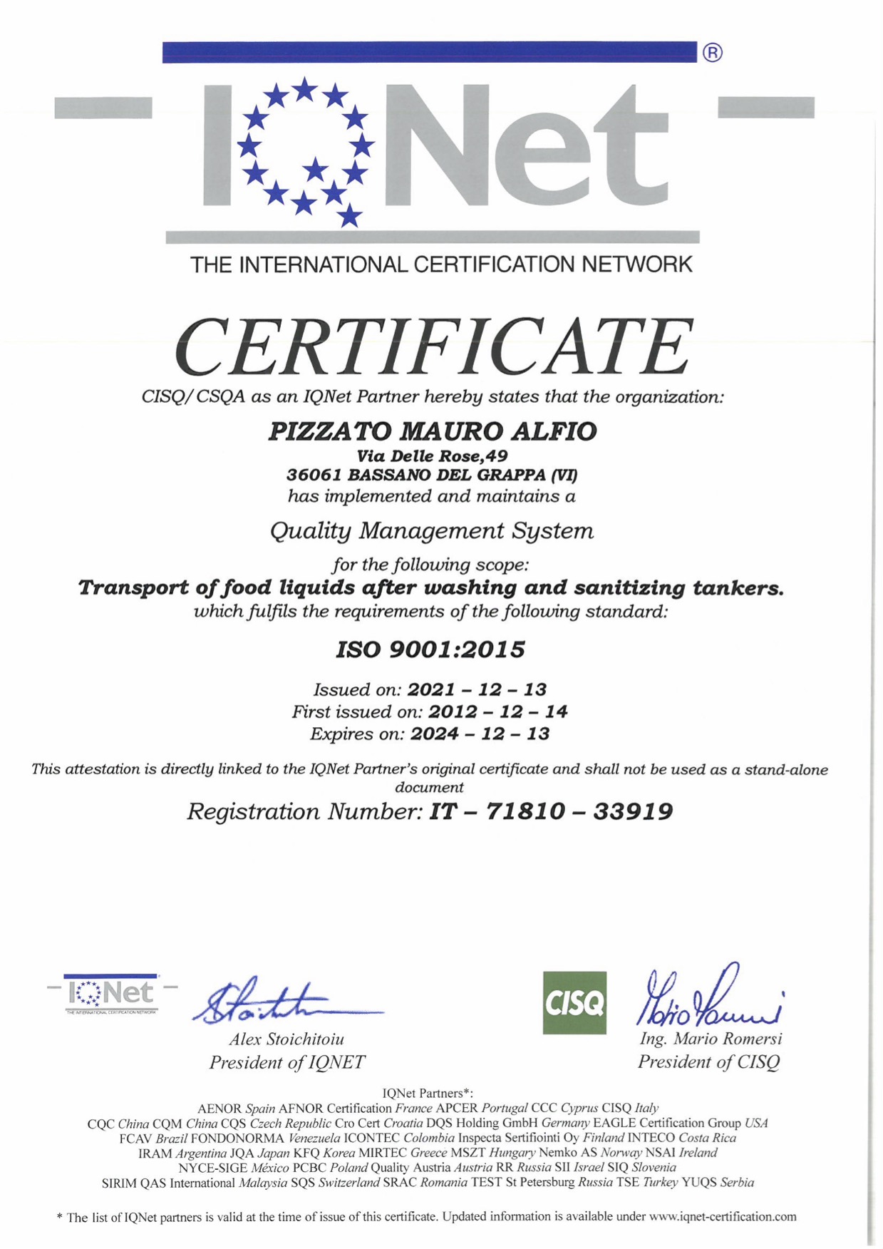 Attualmente Pizzato Trasporti può contare sulle seguenti certificazioni: